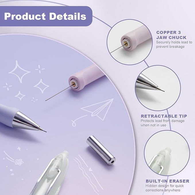 6-Pack 0.7mm Mechanical Pencils with Macaron Colors, Built-In Eraser, Copper Tip, Easy-Load Lead, Metal Clip, Soft Grip, for School, Office, Sketching, Drafting