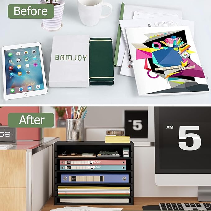 - 【NEAT YOUR DESKTOP】Help you to classify and store your various sizes of paper, file folder, magazines, staples, calculators, notebooks or any other documents, came with 4 MDF dividers can be adjusted freely according to your needs. Bamjoy file sorter organizer will make your home office, classroom, kids room much more organized.