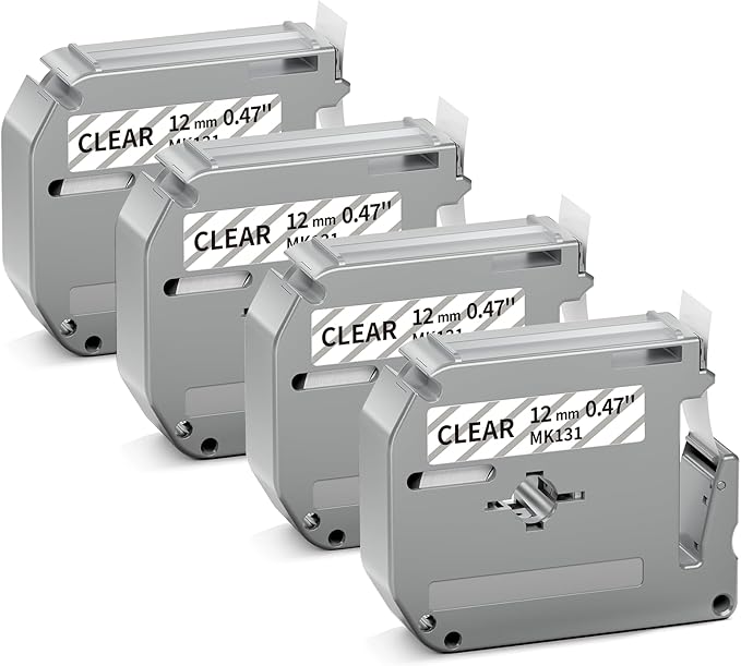 - [Package] 4 packs compatible with Brother m tape m-k131 12mm clear. Model: m-k131 m131 mk131 m-131 m-k131s. Color: black print on clear tape. Width: 12mm 0.47 inch. Length: 8m 26.2 feet each. No-laminated tape
