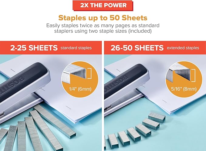 - 2X MORE STAPLING POWER: Easily staples up to 50 sheets –twice as many pages as standard staples! Use standard staples to fasten 2-25 sheets of paper, or use extended staples to secure paper stacks of 26-50 sheets.