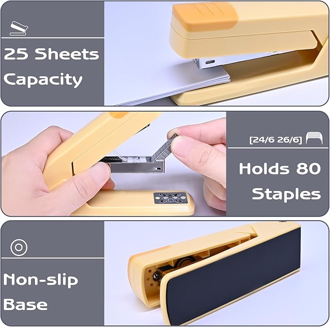 - Non-Slip Base: The rotate desk stapler is paired with a non-slip base that increases the friction between the bottom and the desktop to reduce accidental dropping of the stapler