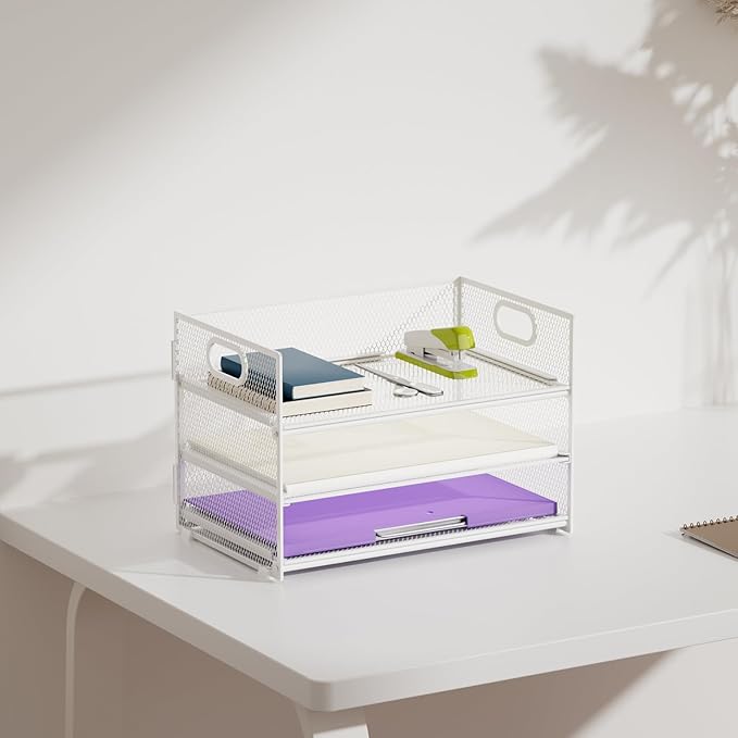 Marbrasse 3 Tier Paper Organizer Letter Tray, Mesh File Organizer with Handle, Paper Sorter Desk Organizer for Home Office Supplies - 2p Pink