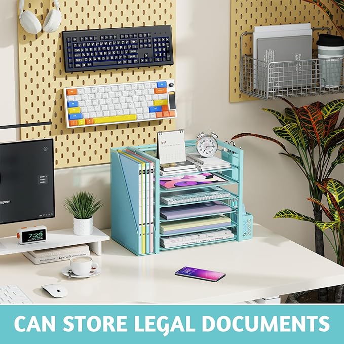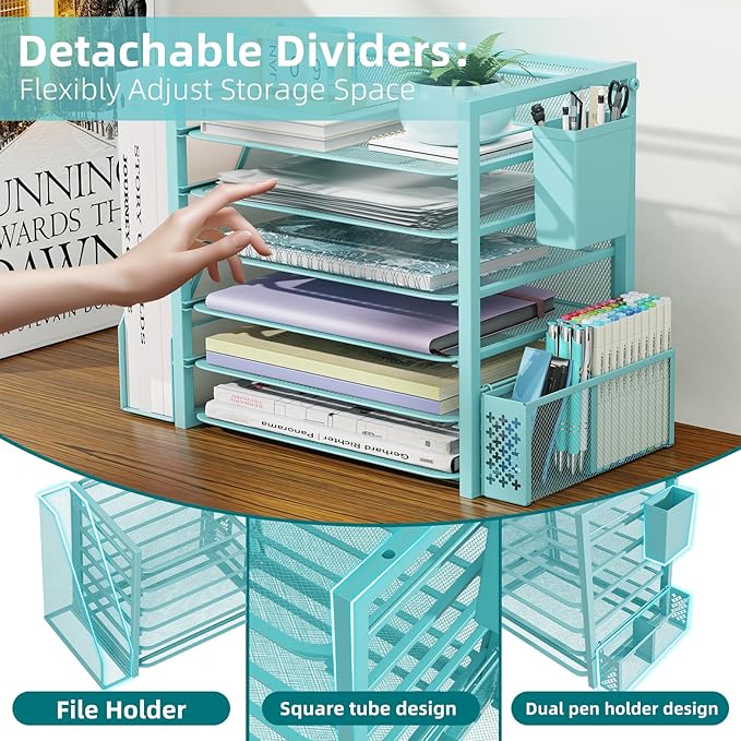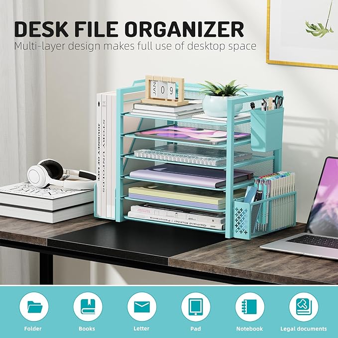 Simple Trending 6 Tier Desk File Organizer, Paper Letter Tray Organizer with File Holder and Pen Container, Blue