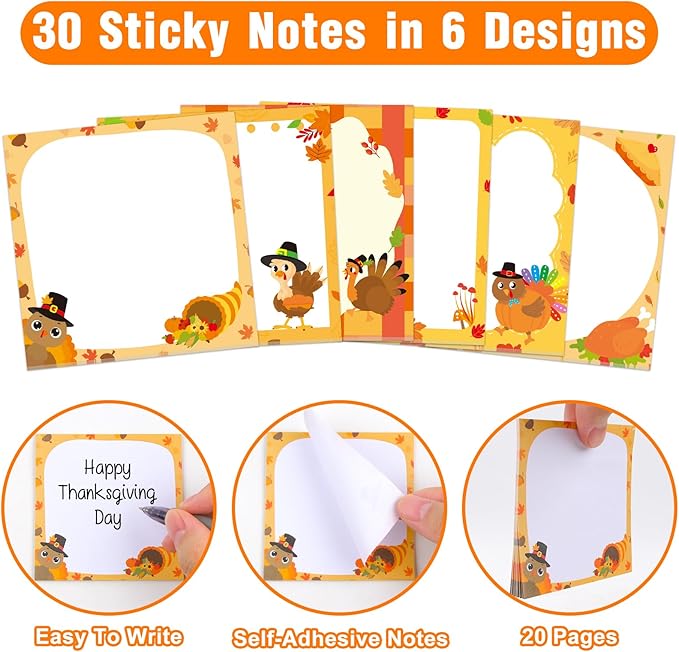 - THANKSGIVING STICKY NOTES. You will get 30 pack thanksgiving sticky notes in 6 different styles, 20 sheets per pad, 600 sheets in total.
