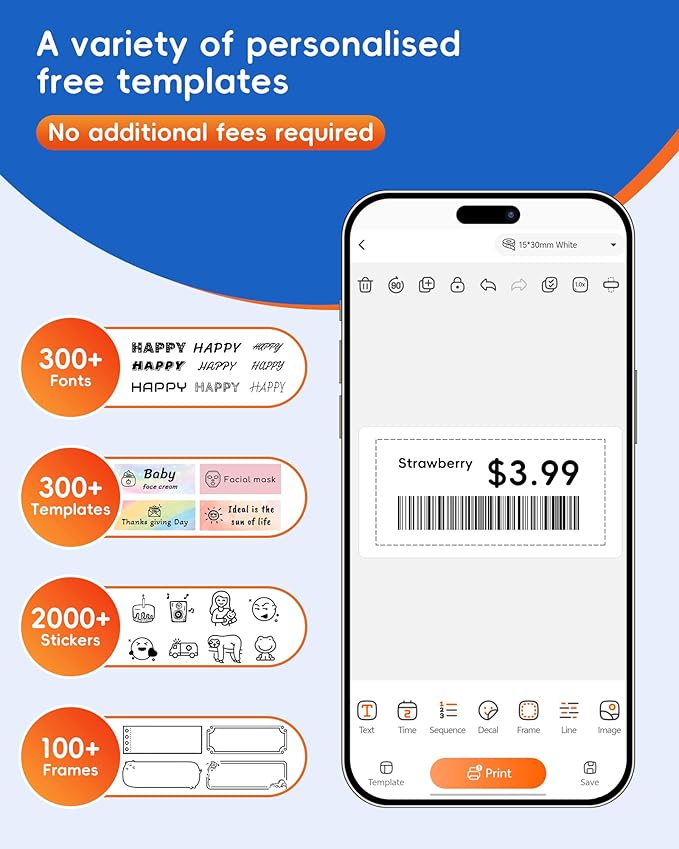 - Rich editing templates: Powerful built-in editor with a vast collection of templates for one-click application, making it easy to create various labels for prices, dates, and organization. Freely change fonts with 300 options, 120 borders, and 2000+ stickers to mix and match, ensuring every label is clear, professional, and visually appealing.(Note:This device only supports black printing. For colored labels, colored patterned label tapes must be used for printing.)