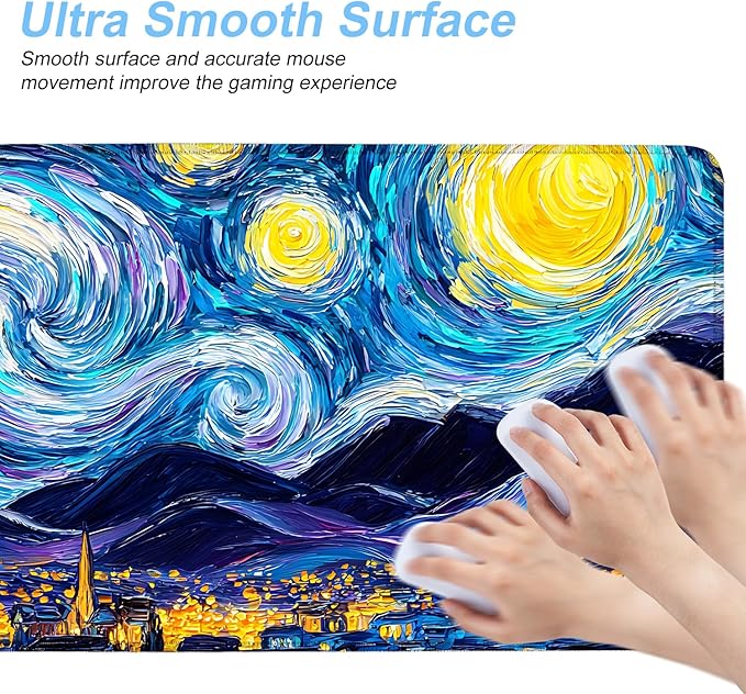 Vincent Van Gogh Starry Night Inspired Mouse Pad – Thicker 31.5" x 11.8" Extended Desk Mat with Dreamy Galaxy and Village Nightscape, Non-Slip Base & Smooth Surface for Office & Gaming