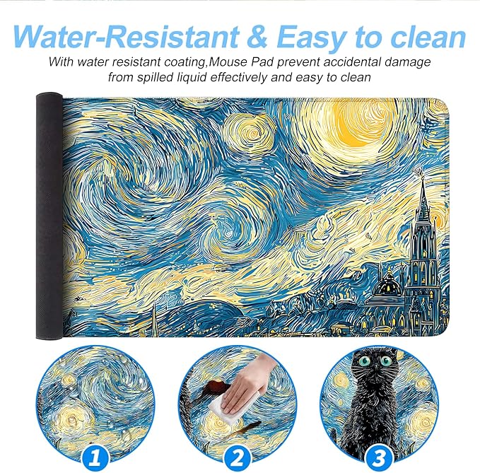 Vincent Van Gogh Starry Night Black Cat Mouse Pad – Large 31.5" x 11.8" Extended Desk Mat with Artistic Swirling Starry Sky Design, Non-Slip Rubber Base, Smooth Surface for Gaming & Office