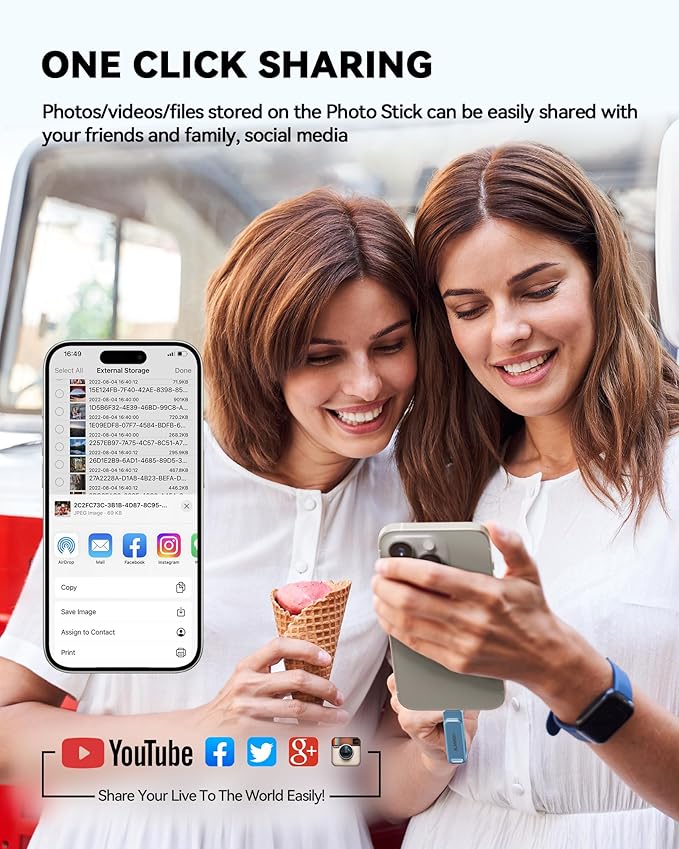 - Fast Data Transfer: This photo stick for iphone uses high-speed transfer port and high-quality flash memory chips, enabling fast data transmission. Whether it is large files, high-resolution photos, or HD videos, it can complete them quickly, saving your time. Furthermore, it also boasts outstanding resistance to high temperatures, water, dust, drops, and magnetic interference. Its built-in keychain design allows you to carry it with you, preventing loss.