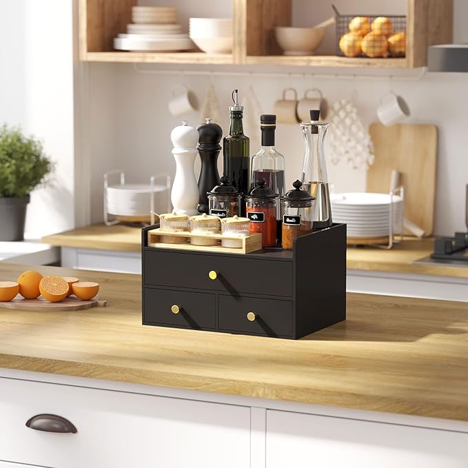 Bamboo Desk Organizer with Drawers Wooden Desktop Storage Organization Box for Bills Office Supplies Kitchen Utensils Organizing Tool for Home Classroom Vanity, No Assembly Required (3 Drawers, Black)