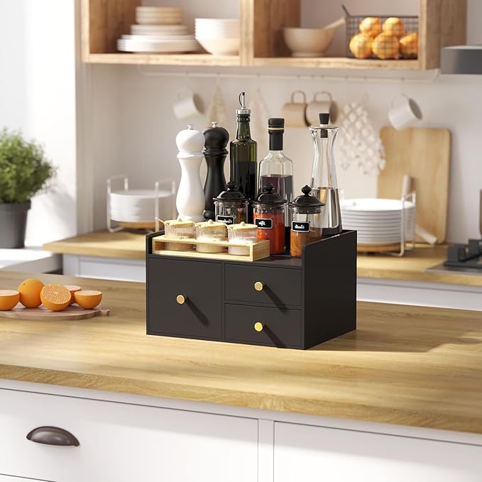 Bamboo Desk Organizer with Drawers Wooden Desktop Storage Organization Box for Bills Office Supplies Kitchen Utensils Organizing Tool for Home Classroom Vanity, No Assembly Required (3 Drawer, Black)