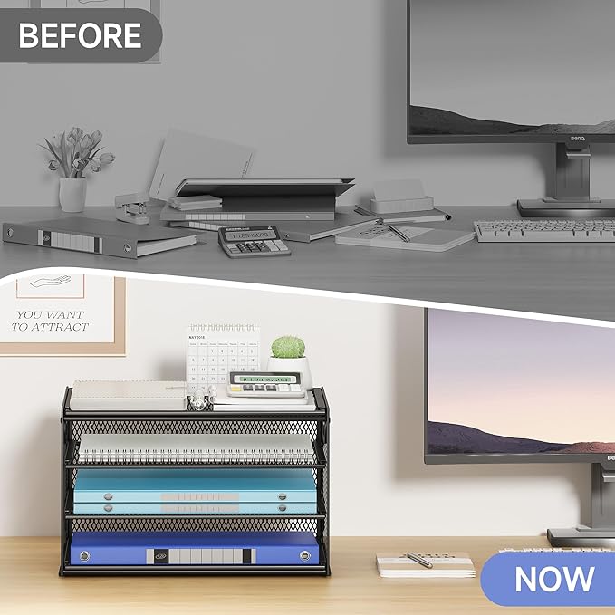 - Paper Organizer Function and Usage: The mesh desktop file organizer can hold various items including paper, folders, books, bills, notebooks, etc. The open design enables quick identification and access to contents, helping to declutter and organize the desk