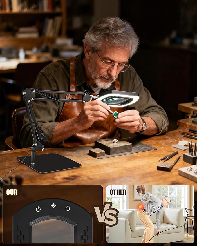 - Stable Heavy-Duty Base: Featuring a wide rectangular base that is non-slip and securely supports the magnifying lamp without falling. The flexible swing arm enables easy multi-angle adjustments, providing precise positioning for ultimate immersion in sewing, painting, or modeling