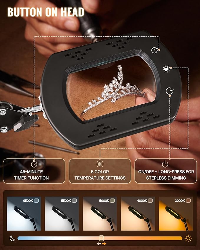 - 5 Color Temperatures & Stepless Dimming: Easily adjust the color temperature and brightness via conveniently located controls on the lamp head, allowing you to maintain soft, glare-free illumination for extended reading and fine detail work - no need to bend down