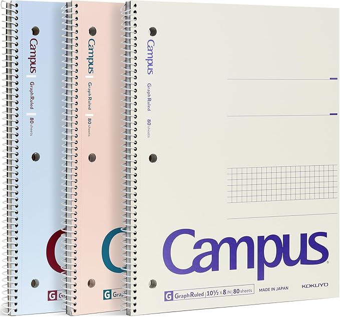 - Japanese Notebook. Kokuyo grid notebook is built with a sturdy spiral binding that keeps the pages securely in place for long-term use. The size of every single subject notebook is 10.5” x 8” and come with 80 gragh papers (5 squares per Inch). Notebook pack of 3 colors (Light Pink, Light Blue, Off-White)