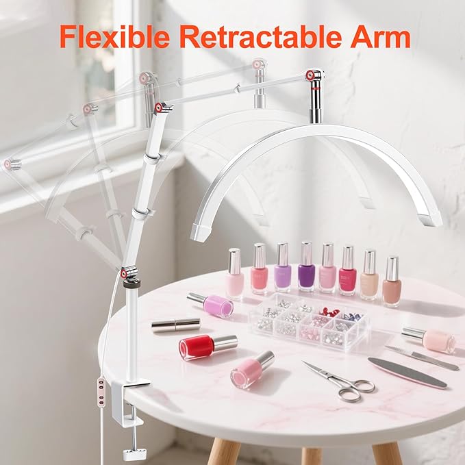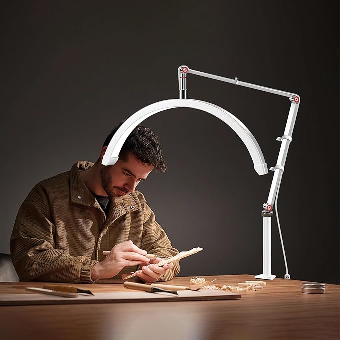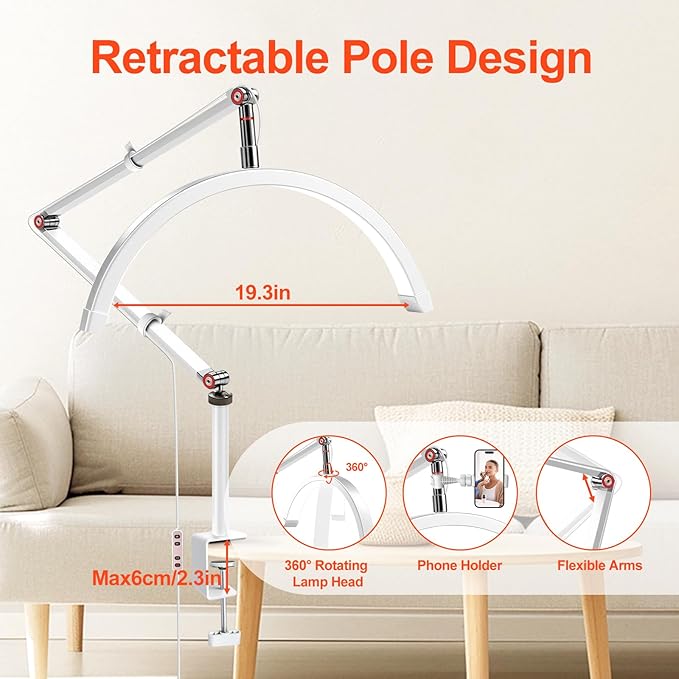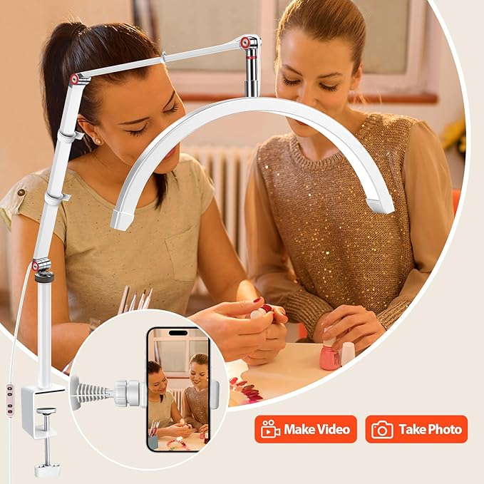 - Phone Holder: 19 inch working half moon desk lamp with phone holder, for taking photos, filming, recording videos, live streaming, beauty teaching, magnifying all details. You can record your eyelashes, nail art, tattoos, handicrafts, teaching and other work moments. Suitable for work and office, this half moon led desk lamp provides a wide coverage range, conforms to ergonomic design, can reduce user pressure, it can be installed in 1 minute, and is easy to operate.