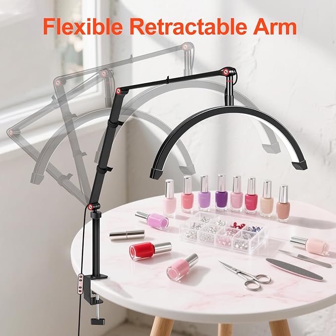 - Phone Holder: 19 inch working half moon desk lamp with phone holder, for taking photos, filming, recording videos, live streaming, beauty teaching, magnifying all details. You can record your eyelashes, nail art, tattoos, handicrafts, teaching and other work moments. Suitable for work and office, this half moon led desk lamp provides a wide coverage range, conforms to ergonomic design, can reduce user pressure, it can be installed in 1 minute, and is easy to operate.