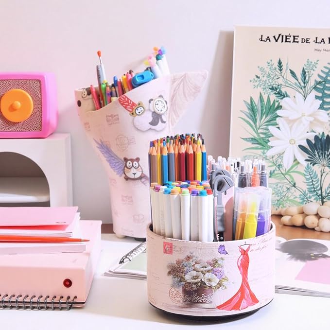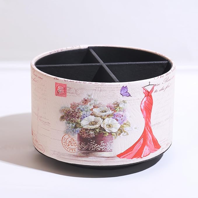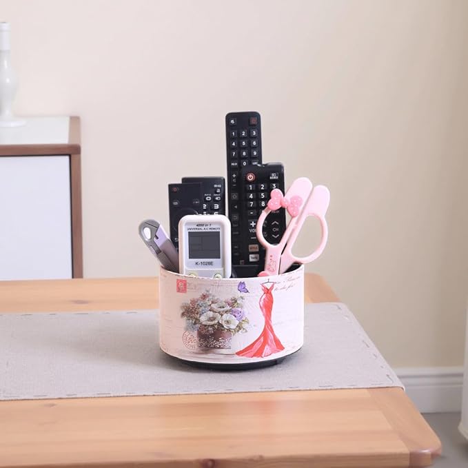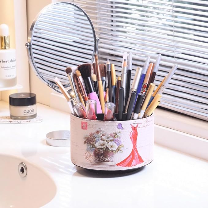 360° Rotate Desk Pen Organizer, Makeup Brush Holder Organizer, Makeup Organizers Countertop, TV Remote Control Holder,Leather Remote Caddy,Dual-Purpose Art Supply Pencil Cup (Red Dress)