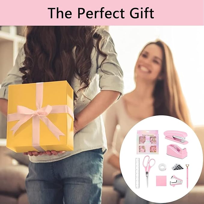 Office Supplies,Desk Accessories,Tape Holder,Stapler,Scissor,Staple Remover,Box of Binder Clips,Staples,Ballpoint Pen,Sticky Notes,Clear Tape,Ruler,Office Supplies Set Pink