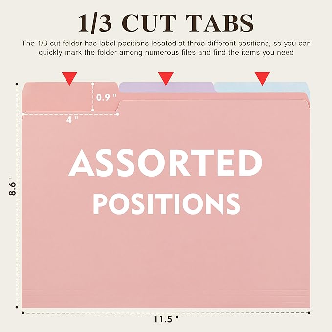 - 1/3 Cut Tabs Files: The package includes 18 pieces 1/3 cut tabs color file folders, and color label paper.