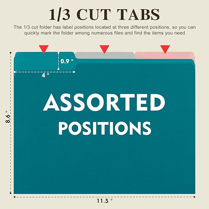 - 1/3 Cut Tabs Files: The package includes 120 pieces 1/3 cut tabs color file folders, and color label paper. A set of 6 colors, with 20 in each color.