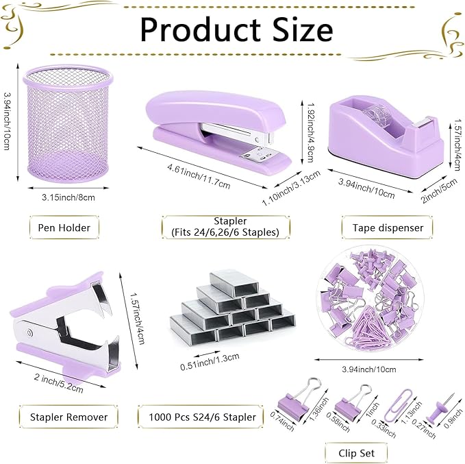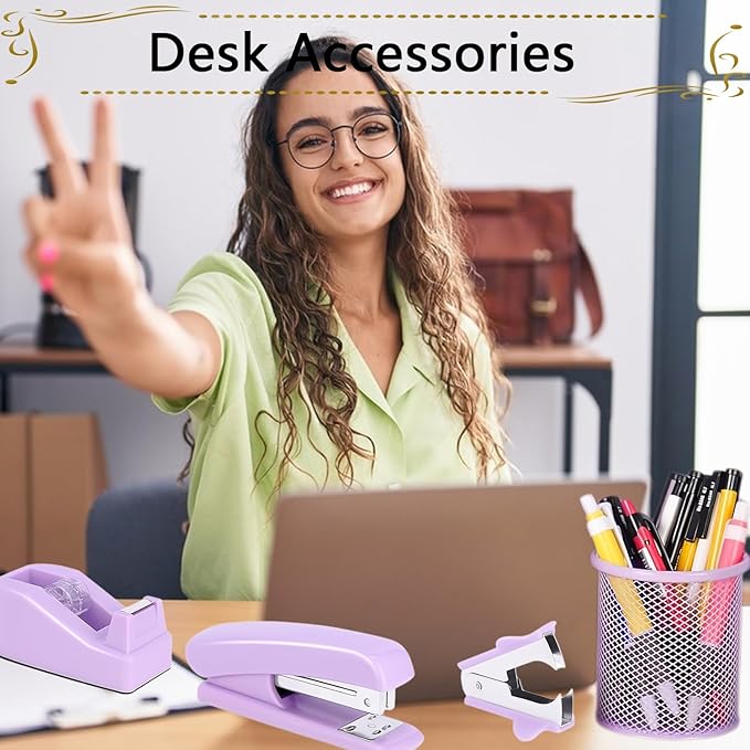 Office Supplies Set,Desk Accessories,Stapler And Tape Dispenser Set,Pen Holder,1000 Staples,Staple Remover,Hinder Clips,Ruler,Scissor,Index Tabs,Clear Tape,Ballpoint Pen,Sticky Notes,Coworkers(Purple)