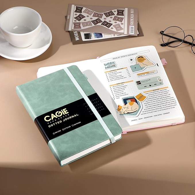 CAGIE Bullet Dotted Journal Notebook 320 Pages 100 GSM Paper Hardcover A5 Dot Grid Notebook Leather Journals for Writing Women Men Work Journaling, Green