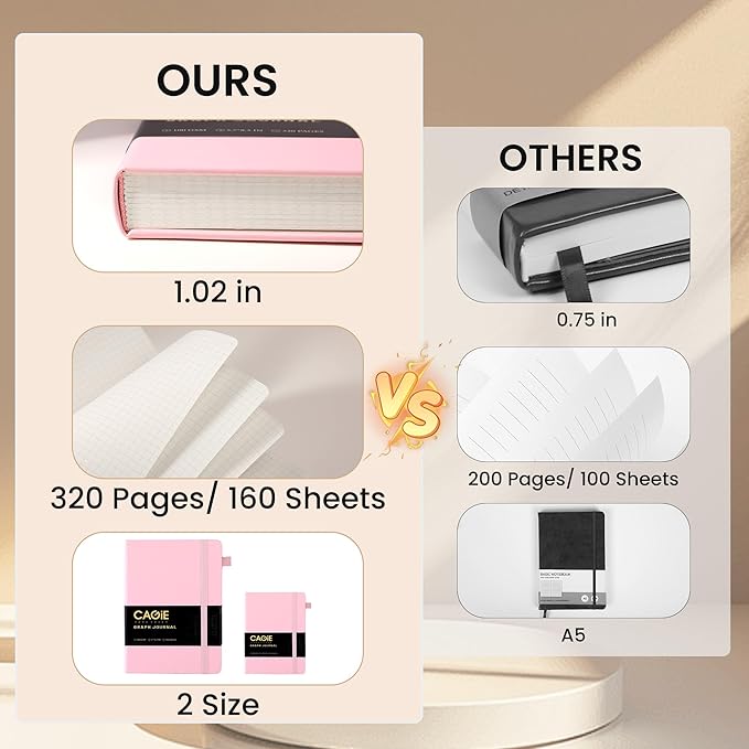 - GRAPH PAPER NOTEBOOK: A5 graphing notebook (5.7'' x 8.3'') features 320 pages with a durable vegan leather hardcover. Inside, 5mm × 5mm graph paper are complemented by a storage pocket, ribbon bookmark, and elastic closure band