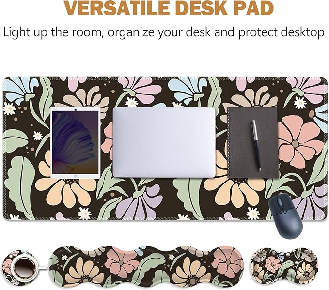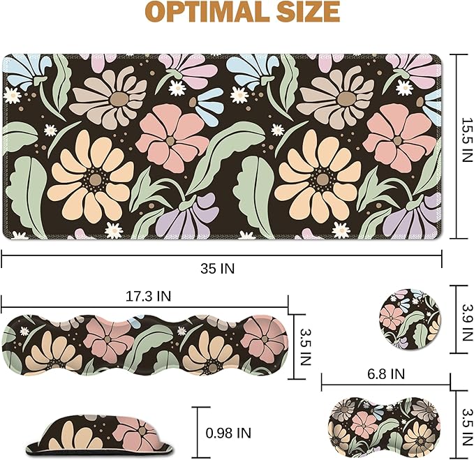 - 【4-in-1 Mouse Pad Set】Ergonomic mouse pad includes desk pad (35x15.5inch), keyboard wrist rest(17.3x3.5inch), mouse wrist rest(6.8x3.5inch),free cup coaster(3.9x3.9inch).No need to buy separately, at a super cost-effective price. This desk pad for keyboard and mouse, is large enough to fit your mouse, gaming keyboard, and other desk items. Keep a clean, uncluttered desk. This helps to improve the gaming experience or work efficiency in the office.