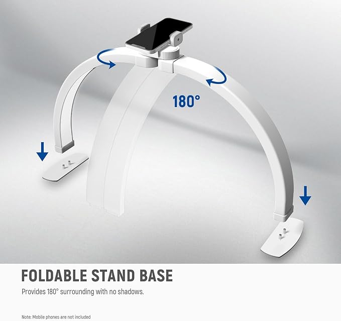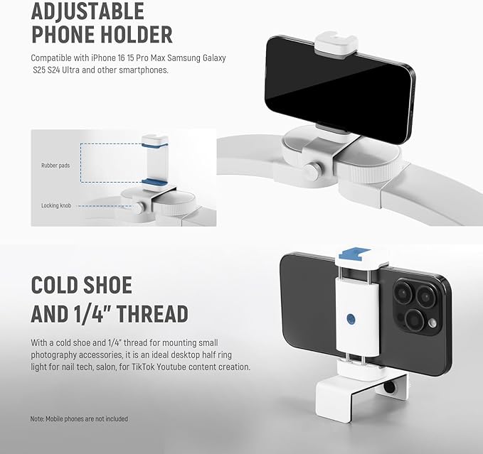 - 【Adjustable Phone Holder】 The cell phone mount of the portable LED half circle desk ring light is compatible with iPhone 16 15 Pro Max Samsung Galaxy S25 S24 Ultra, etc. Easily attached via a locking knob, it is rotatable and adjusts along the lamp edge for versatile shooting angles. With cold shoe & 1/4" thread for small photography videography accessories, ideal as desktop half ringlight lighting for nail tech selfies, pictures, video recording, filming for YouTube TikTok social media sharing