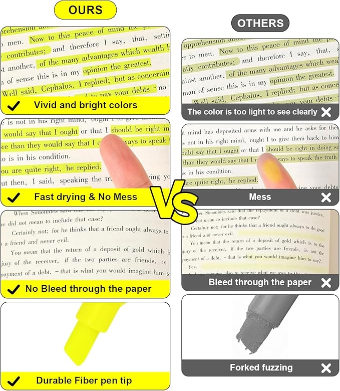 - Non Bleed & Quick-Drying Highlighter - no bleed highlighters use quick-drying ink, making highlighted marks clearly visible without worrying about the ink staining your hands and your book. Even if you highlight on one side of the page, the other side is still completely readable, and there's no need to worry about ink bleeding through and affecting the readability of the page.