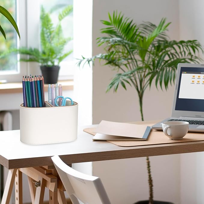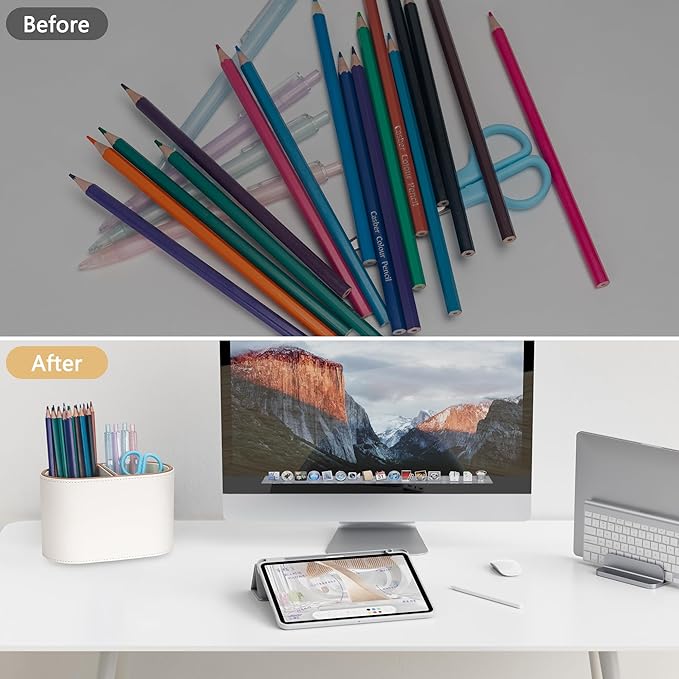 - Dual-Compartment Design: The unique two-section design brings organization to your space. Easily separate pens and pencils from items like sticky notes and paper clips, or distinguish between personal and office supplies to eliminate desktop clutter and boost work or study efficiency.