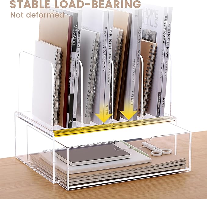 - 【All-in-One Desk File Organizer】This multifunctional acrylic desk organizer features 4 vertical compartments file holder and 1 sliding drawer, making it ideal as a file organizer for desk to neatly store folders, papers, mails, letters, documents, and office essentials.