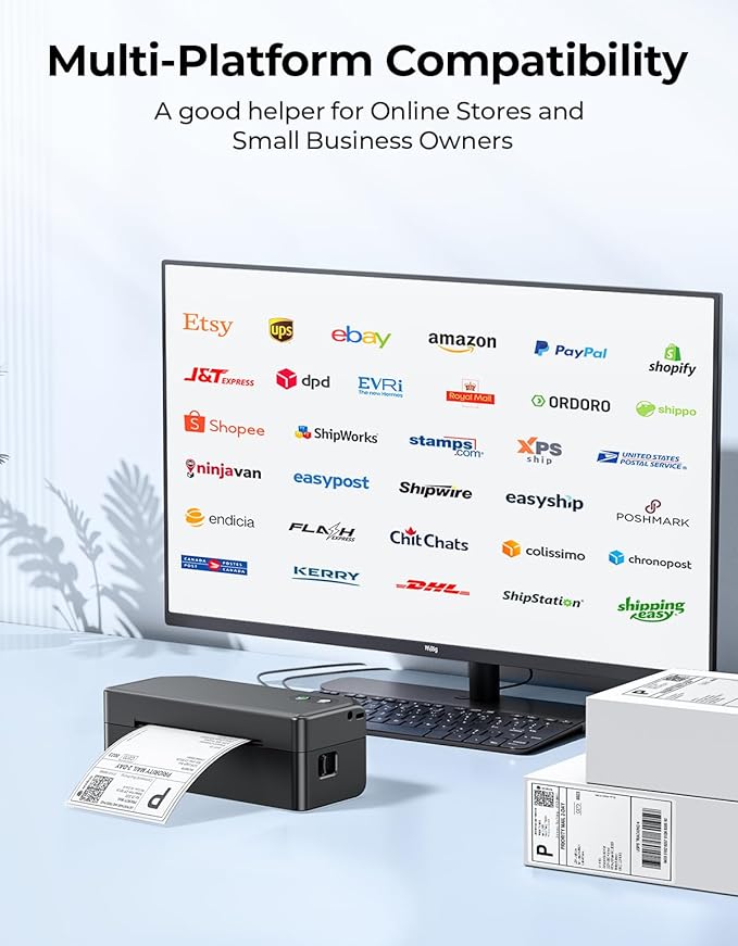 - Wide Compatibility with Platforms & Labels: The thermal label printer is ideal for small businesses, supporting label sizes from 1.57" to 4.3". It's compatible with major shipping platforms like Amazon, UPS, FedEx, USPS, and Etsy, covering all your labeling needs