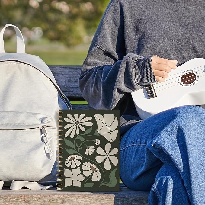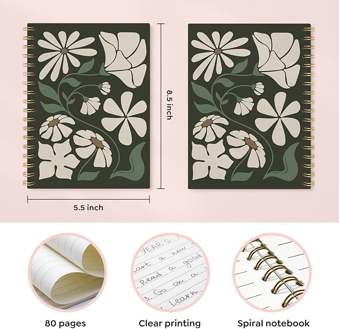 VONTP Boho Abstract Floral Spiral Notebook, Green Flower Aesthetic Journal, Boho Office Supplies, Abstract Botanical Floral College Ruled Notebook Journal for Writing, 5.5x8.3