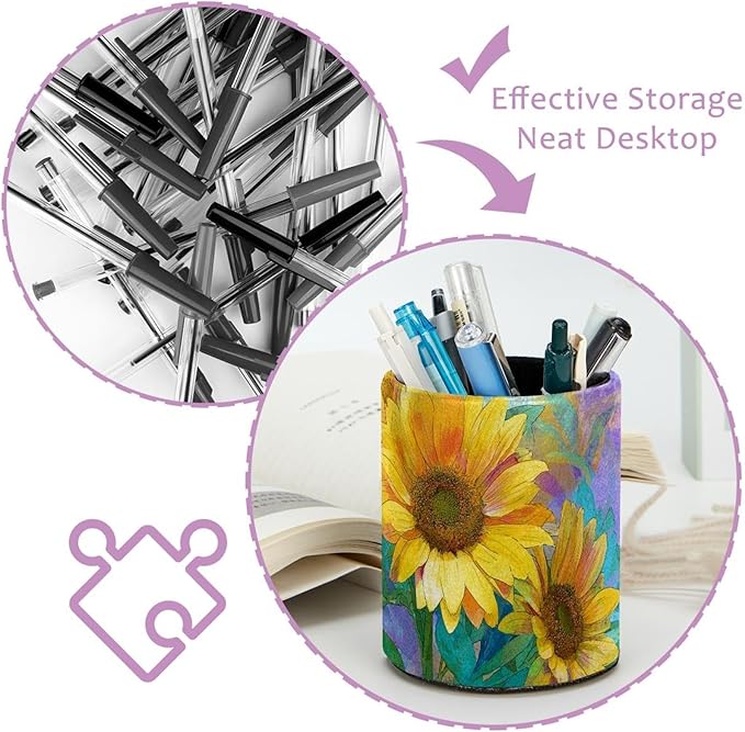 Watercolor Art Sunflower Circular Pen Holder, Pen Cup Makeup Brush Holder, Design for School, Home and Stationary Supplies (3.9 x 3.1 Inches)