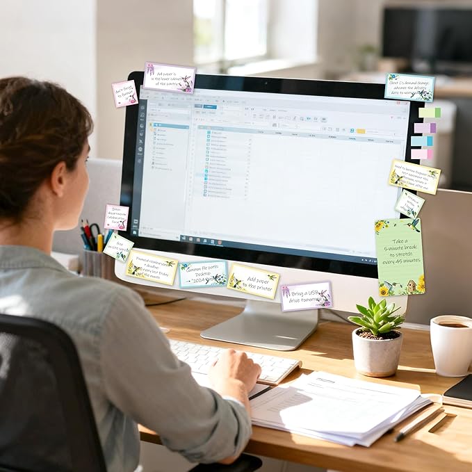 - Quality Paper: No more worrying about curled edges or notes that fall off! These memo pads feature a reliable adhesive strip that holds firmly to most smooth surfaces—like books, laptops, desks, and mirrors—yet peels off without leaving any sticky residue behind. The good-quality paper prevents ink from bleeding through.