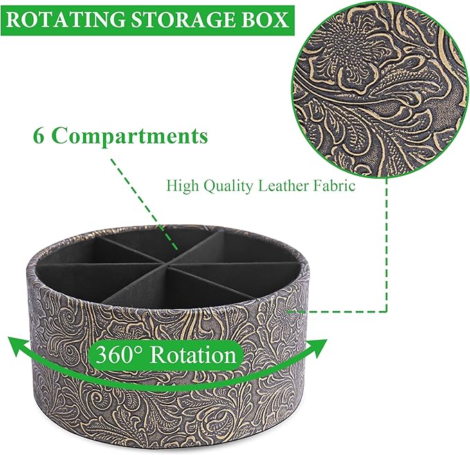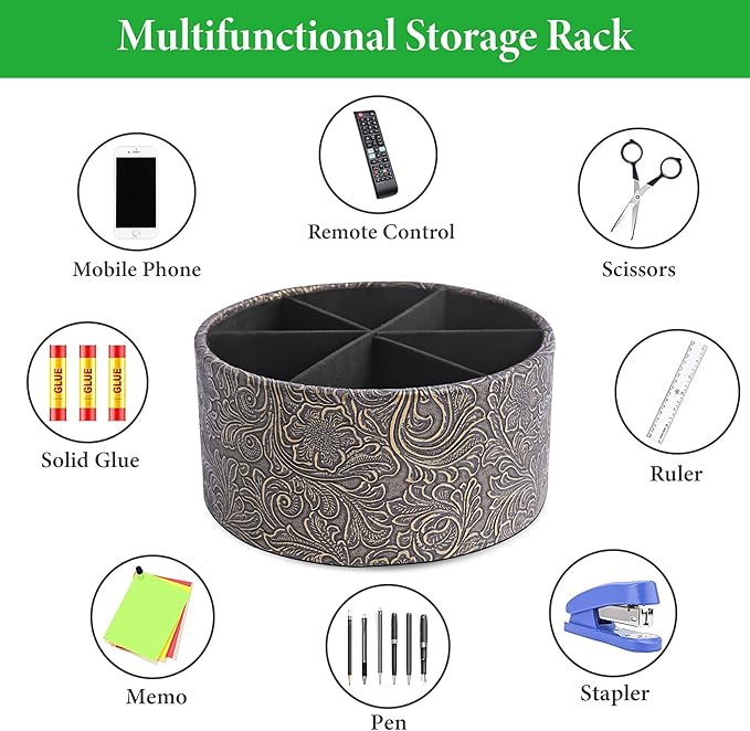 lizimandu Remote Control Holder, 360°Spinning PU Leather Desk TV Remote Caddy,Desk Storage Box Room Accessories for Controller, Media,Mail,Calculator, Mobile Phone,Pencil(1B-Carved Cooper Gold)
