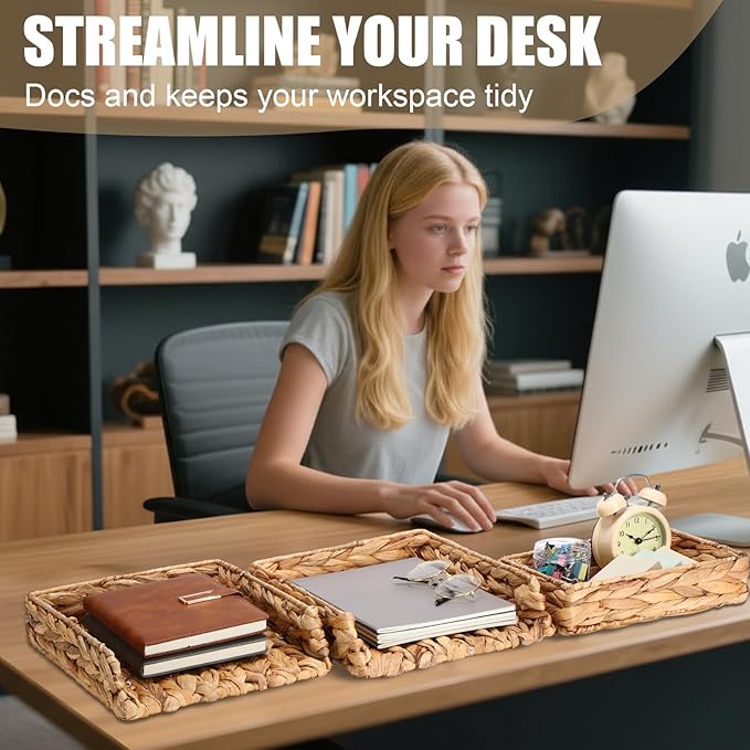 - Package Contents: this pack includes 2 large paper tray organizers (13"x9.45"x2.17") and 1 small paper tray organizer (9.45"x6.7"x2.17"), all handwoven from natural water hyacinth; The desk organizer set adds organic elegance to any workspace while providing practical storage solutions for documents and office supplies