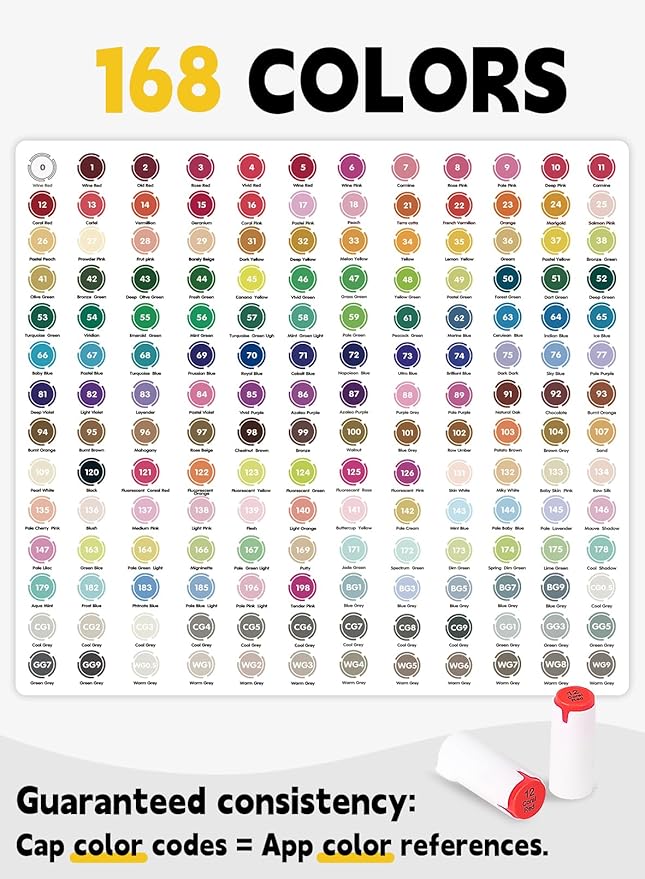 YHC 168 Colors Alcohol Brush Marker with Free App, Chen Rui Dual Tips Art Markers for Adults and Kids, Alcohol Based Brush & Chisel Tips Markers for Drawing, Coloring, Painting, Sketching