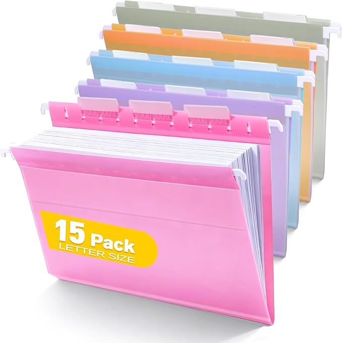 Plastic Hanging File Folders, Letter Size Pastel 15-Pack – Expandable Bottom, 1/5-Cut Tabs for Filing Cabinets & Office Organization