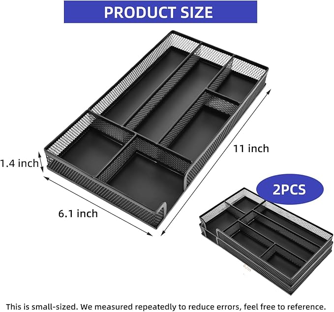 - 【Desk Drawer Organizer Set】The set includes two small organizers, ideal for shallow or narrow desk drawers. They can also fit in large drawers (which can easily hold both organizers), or you can place them directly on your desktop to categorize and store various office supplies.