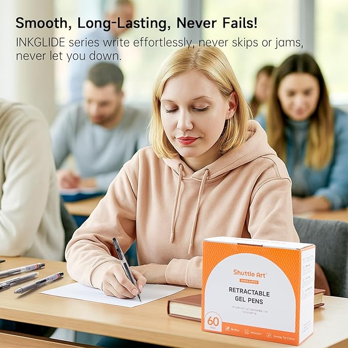 - 60 PACK VALUABLE BULK SET: Shuttle Art INKGLIDE new series come with 60 pack black retractable gel pens (4 sets of 15 pens). Bulk set is great for long time storage and easy distribution. The 0.5mm tip allows for precision and clarity in writing, making it ideal for detailed work in everyday use.
