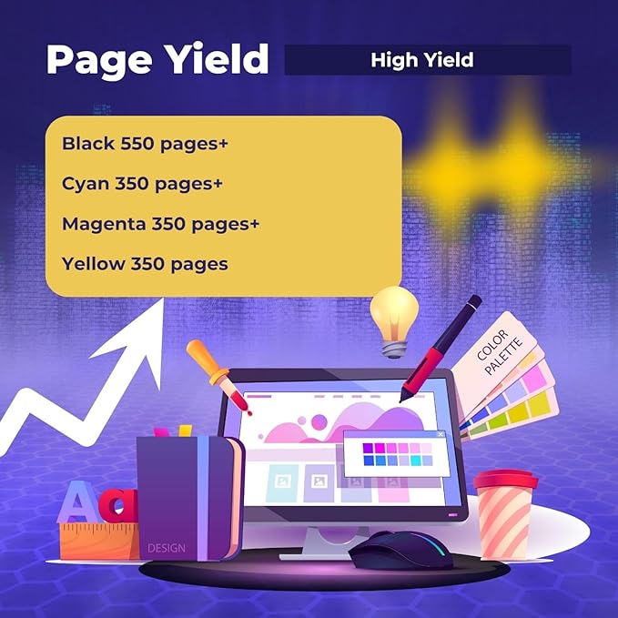 - Page Yield: Black 500 pages+Cyan 350 pages+Magenta 350 pages+Yellow 350 pages(at 5% coverage of A4 paper).