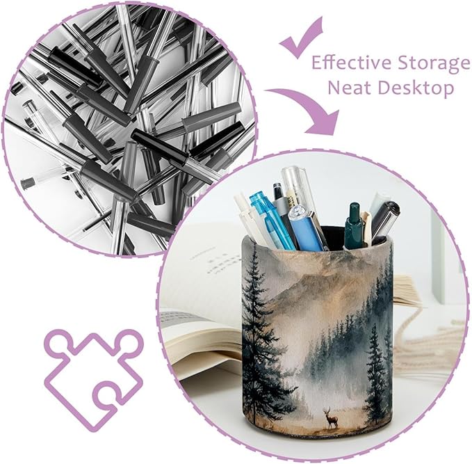 Watercolor Mountain Deer Circular Pen Holder, Pen Cup Makeup Brush Holder, Design for School, Home and Stationary Supplies (3.9 x 3.1 Inches)
