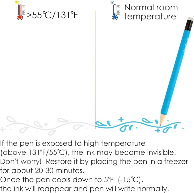 - Tips for Best Use - This pen is sensitive to temperature; if it's exposed to high temperature (above 131℉/55℃), this ink may become invisible. This can happen if a document is left in a hot car or if the pen is stored in a vert warm place. Under this situation, simply place them in the freezer (around 0°F / -18°C) for a few hours or 20-30 minutes. Once the pen cools down to 5℉ (-15℃), the ink will reappear and the pen will write normally again. For any product-related issues, please don't hesitate to contact our support team directly.